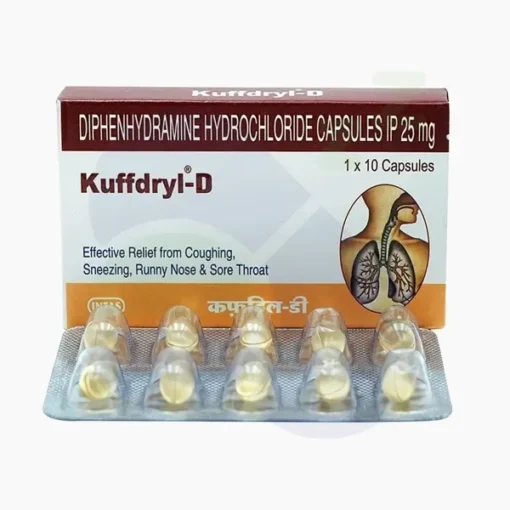 Kuffdryl-D Softgel Capsule is a medication classified as an antihistamine, primarily used to alleviate symptoms associated with allergies and the common cold. This includes sneezing, a runny nose, itching, and coughing. Allergies occur when the immune system responds to foreign elements, known as allergens, which are typically harmless to the body. Additionally, Kuffdryl-D Softgel Capsule is utilized to induce sleep, treat Parkinson’s disease, and relieve coughs caused by minor throat or airway irritation. It contains a Nytol ingredient, which is known for its sleep-inducing properties.